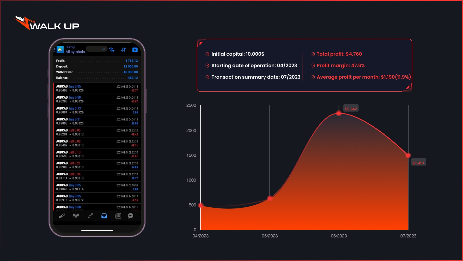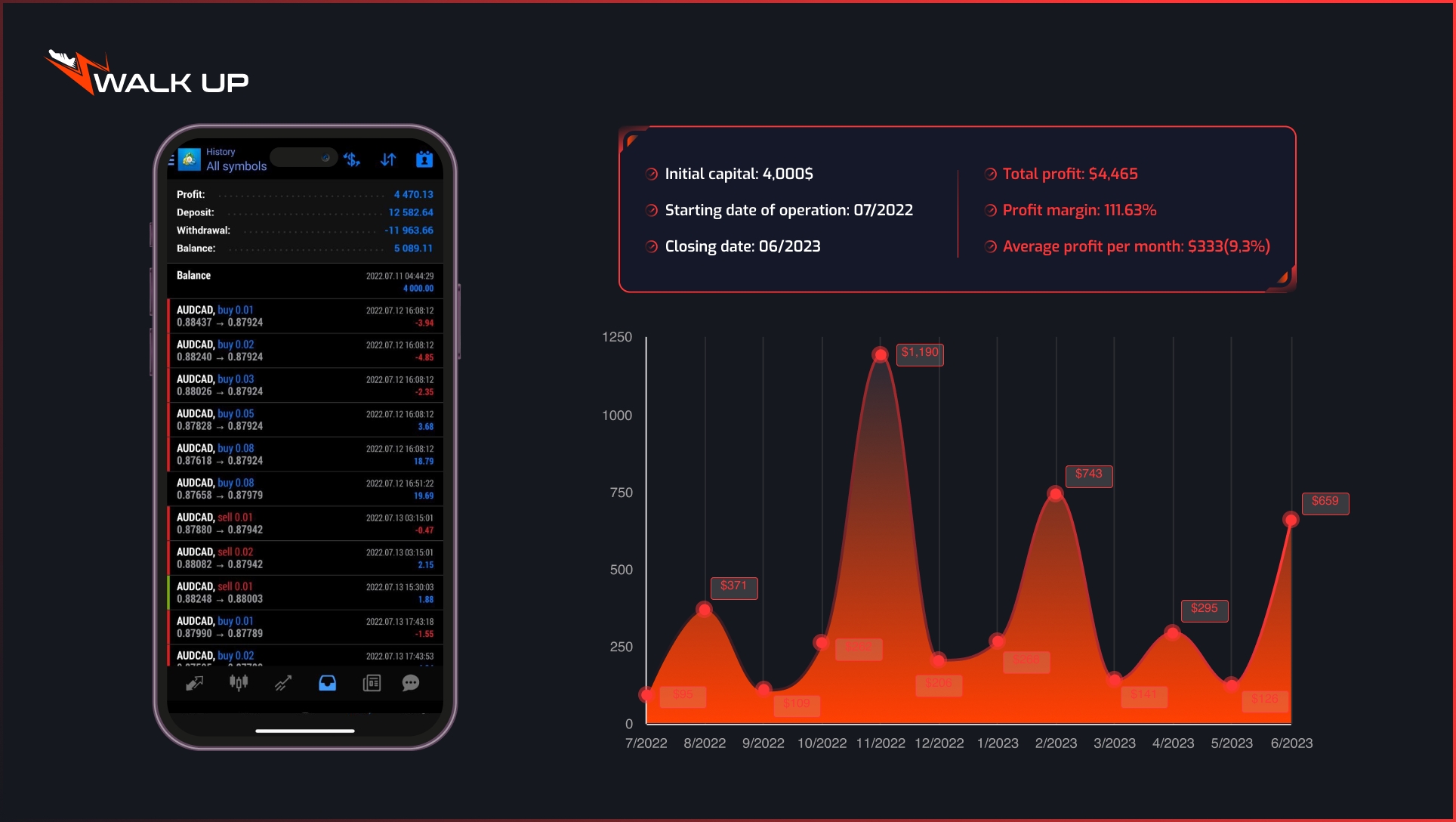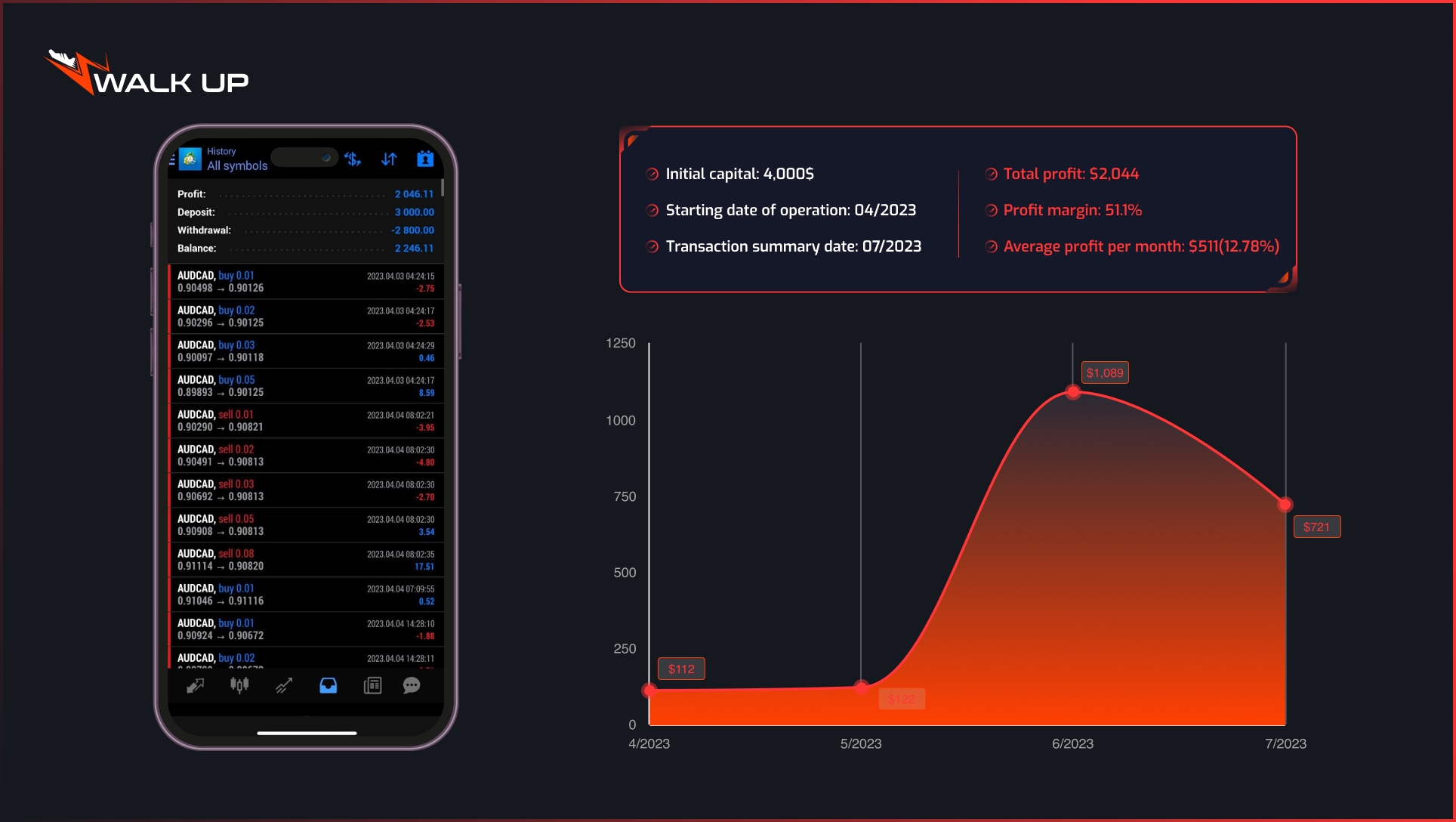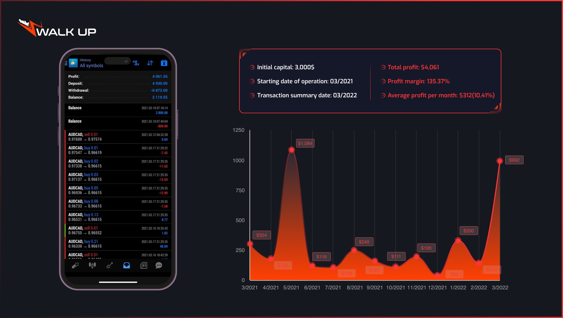 Walk Up์ AI ํธ๋ ์ด๋ฉ ์๊ณ ๋ฆฌ์ฆ์ 2021๋ ์ดํ ์ง์์ ์ผ๋ก ์์ต์ ์ฐฝ์ถํด์์ต๋๋ค. ๊ทผ 3๋ ๊ฐ์ ์ด์ ๊ธฐ๊ฐ ๋์ ์ด ํธ๋ ์ด๋ฉ ๋ด์ Walk Up ์ํ๊ณ ๋ด์ ์ด์ฉ์์ ํฌ์์์๊ฒ ๋งค์ ์์ต 5~20%๋ฅผ ์ ๊ณตํด ์์ต๋๋ค.